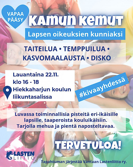 - Kamun kemut Lapsen oikeuksien kunniaksi la 22.11. klo 16-18 Hiekkaharjun koululla