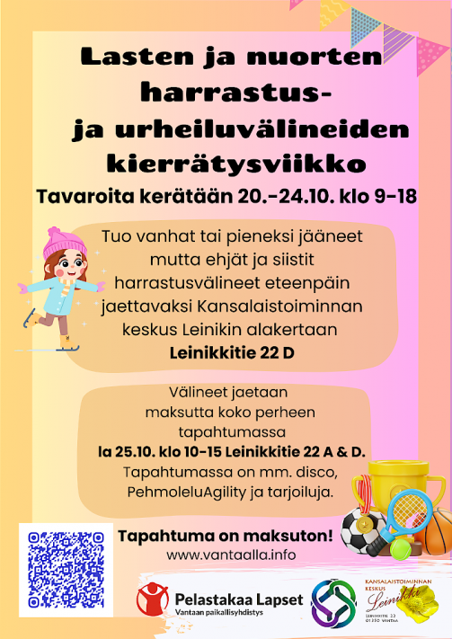- Lasten ja nuorten harrastus- ja urheiluvälineiden kierrätysviikon tapahtuma la 25.10. klo 10-15 Kansalaistoiminnan keskus Leinikissä